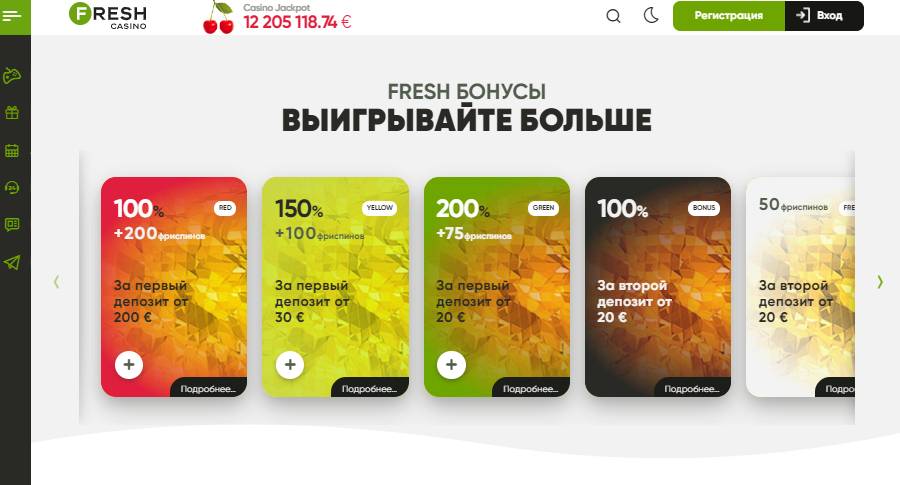 Щедрая бонусная политика упоминается практически в каждом высказывании о Fresh Casino. Денежные вознаграждения и поощрения для продуктивной игры предлагаются и новым участникам, и тем, кто играет на просторах виртуального заведения ежедневно: