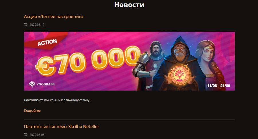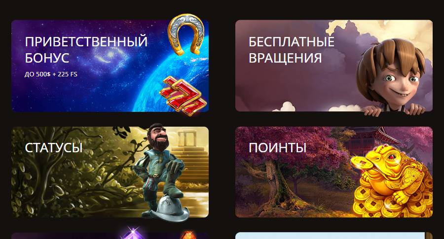 Казино предлагает новым игрокам приветственный бонус в виде 100% увеличения депонируемых средств и одновременно с этим бесплатные прокрутки на различных слотах. Если в результате прокруток выпадает приз, то он зачисляется в счет бонуса, увеличивая его значение.
